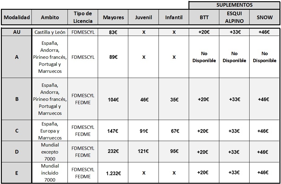 Los precios de las licencias para las distintas modalidades que queramos practicar son los siguientes (en la tabla ya está incluida la cuota del club, 32€ para mayores, 22€ para juveniles y 17€ para infantiles):
